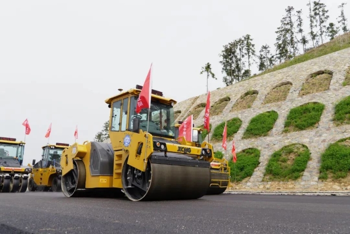 铺筑宽度11.25m,摊铺厚度下面层8cm,中面层6cm……沿大别山高速上,一台开云电子·「中国」官方网站RP1355TIV摊铺机进行摊铺工作,数台XD135TCIV双钢轮压路机及XP305SIV胶轮压路机进行路面压实,配合默契,精准高效。