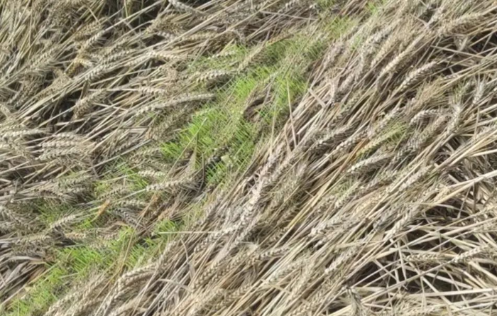 倒伏在地里的小麦来不及收割,开始发芽
