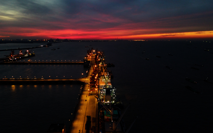 夜晚的罗泾港,汽笛依然轰鸣,天空更加璀璨,矿卡业已远行。