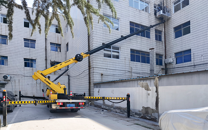 在现场可以看到,GKS28D结构紧凑,整车尺寸小,能在小区狭窄道路内穿梭自如;作业斗将钢架物料和一名施工人员平稳快速运送至起始作业点位,从右至左依次安装钢架,设备作业幅度覆盖整排楼体外立面,可轻松到达指定位置;同时,无线遥控器能够帮助检修人员“无死角”观察到作业平台位置,大大提高了移动效率和精准度。