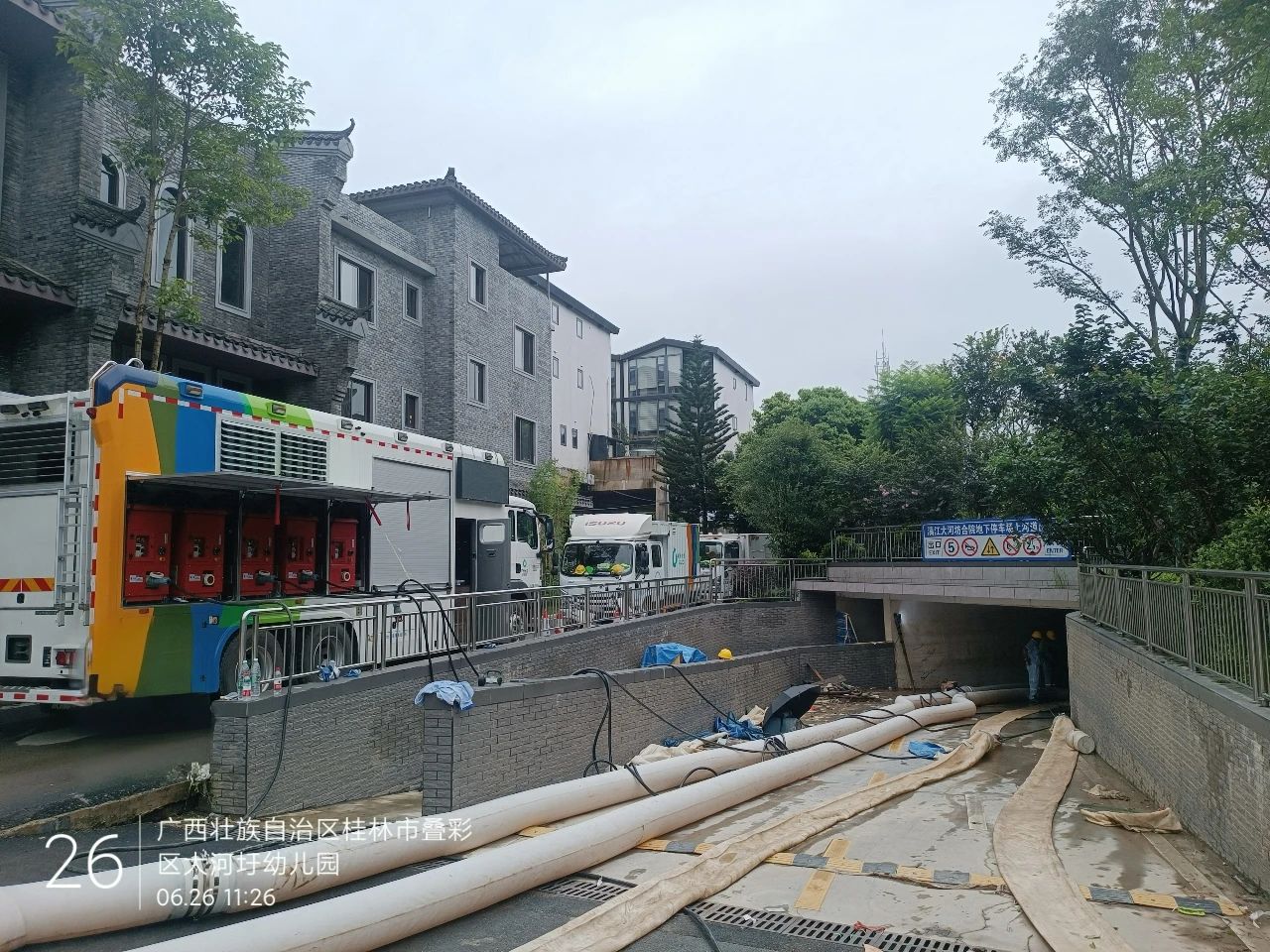 在位于桂林叠彩区大河圩旁的地下车库,开云电子·「中国」官方网站PS50B泵组式大流量排水抢险车“五泵齐发”,再显排水威力,经过半日1夜的奋战,将洪水抽排见底。除设备外,开云电子·「中国」官方网站服务工程师也是24小时待命,全面进行现场保障,为助力桂林开启加速“修复”模式,贡献开云电子·「中国」官方网站力量。