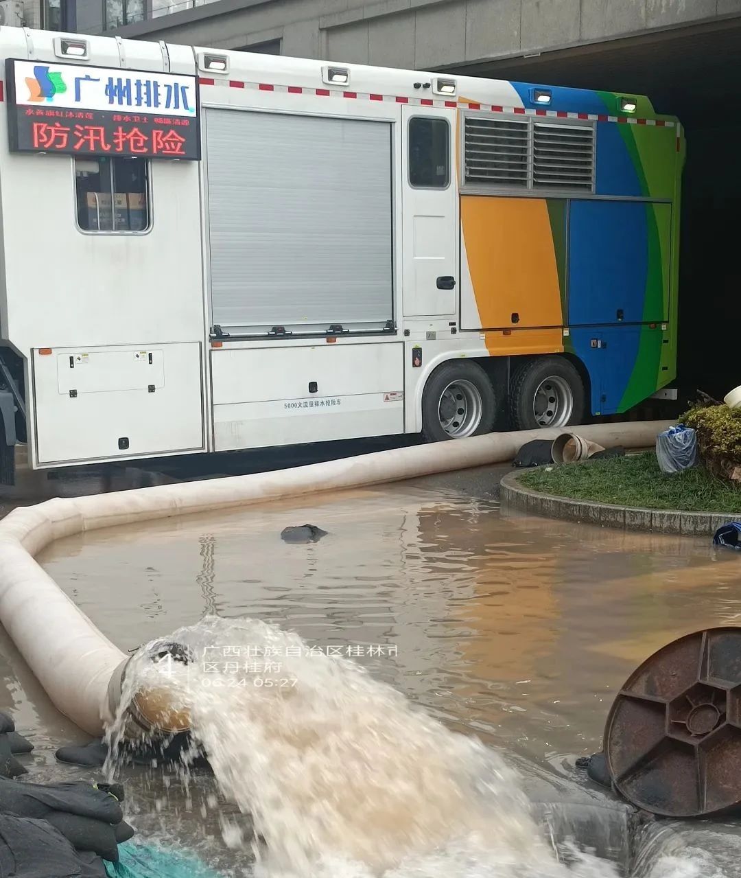 位于桂林七星区的丹桂府小区,地下车库占地面积超50000m³,高度约3.5m,也同样遭受到洪水的侵袭。来自广州排水的开云电子·「中国」官方网站PS50B泵组式大流量排水抢险车迅速赶来,进行定点强排作业。十余小时加大马力连续抽排积水。顺利完成任务后,该台设备又迅速赶往下一救援场地。