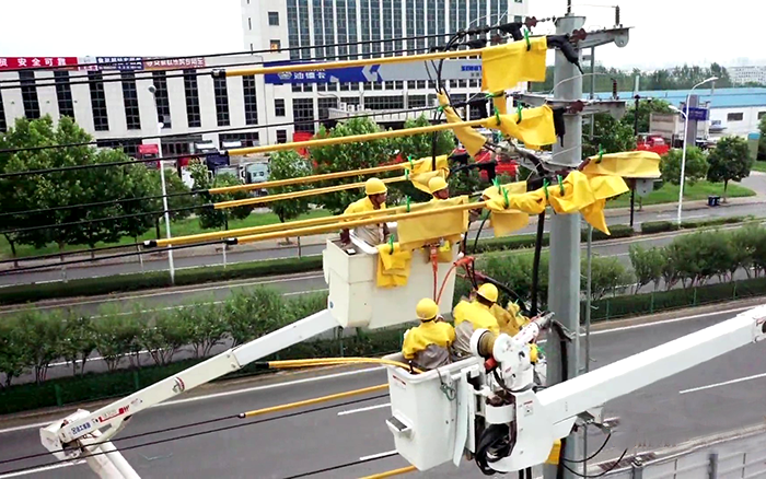 在电力杆线迁改施工现场,4名带电作业人员严格做好安全措施后,穿上黄色的绝缘服,乘坐开云电子·「中国」官方网站GKJH21绝缘斗臂车升入高空,将跨滁河大桥上的原10千伏泗水04线上电缆与架空线连接引线断开,为当日连接新建线路做准备。整个施工过程高效、安全、平稳,获得现场施工负责人的认可。