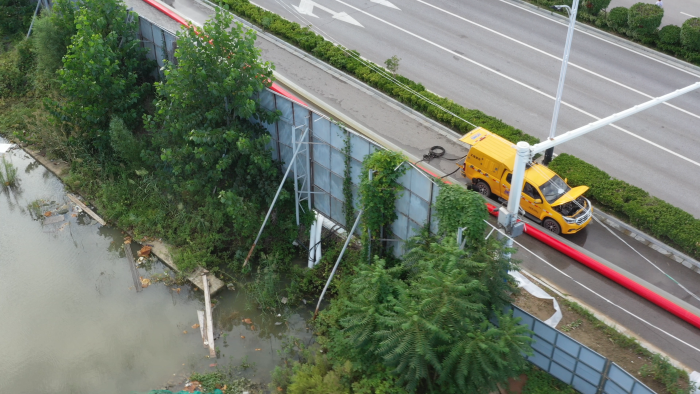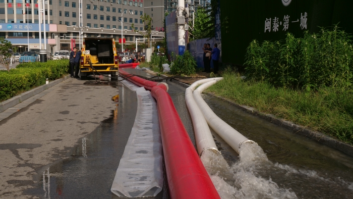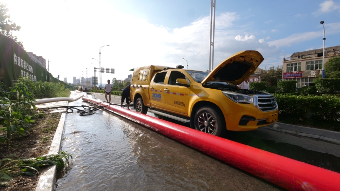调试车辆、铺设水带、检查管路,现场排水作业紧锣密鼓地进行着。XGH5030TPSQ6争分夺秒与时间赛跑,每台车流量超600m³/h,最大可达1000m³/h,将积水源源不断地排入下水道中。