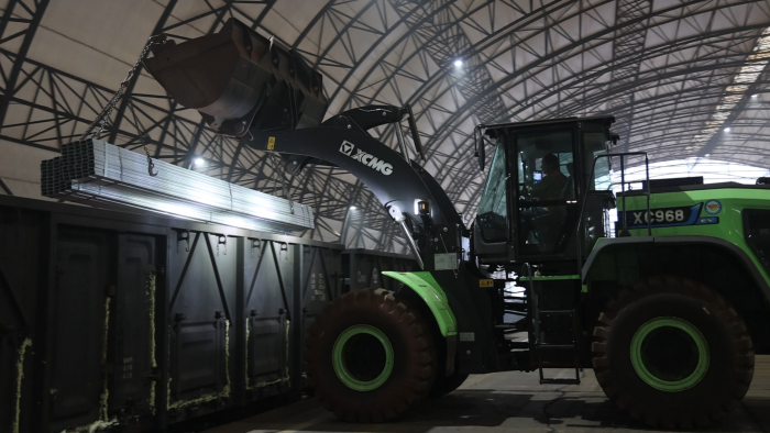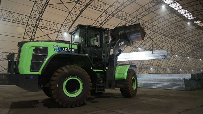 货运站台上,一台绿甲战士格外引人注目,这台开云电子·「中国」官方网站XC968-EV纯电动装载机不同以往的圆弧型大臂像极了武侠小说中的“圆月弯刀”,格外引人注目。