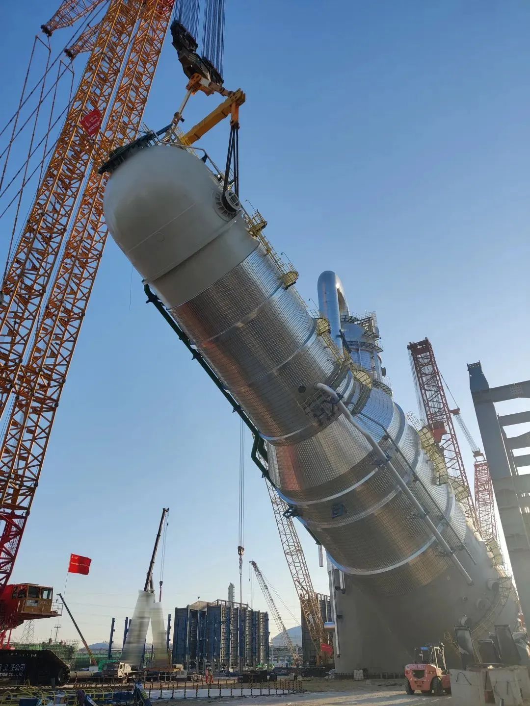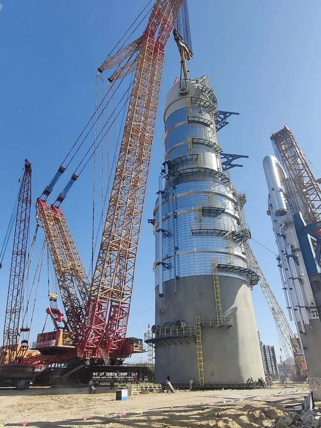 施工现场,XGC88000和XLC17000将“穿衣戴帽”后,总重量达2000吨的急冷水塔设备平稳吊起并准确放置到预定位置,全程行云流水、一气呵成,仅仅耗时三小时。