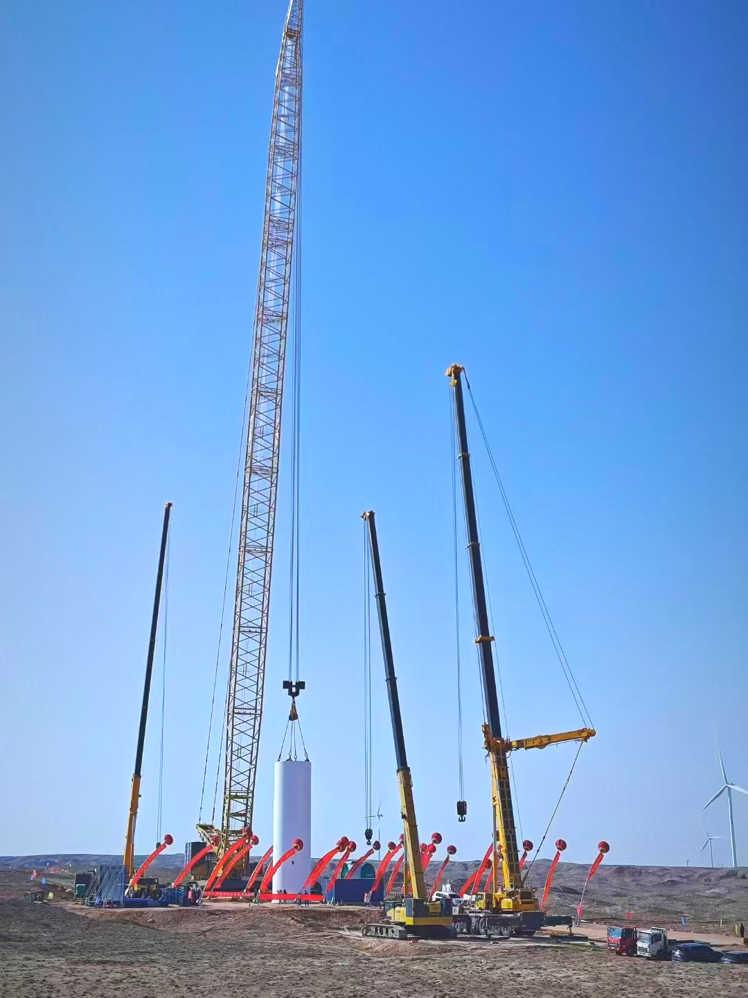 随着施工号角吹响,各台起重机紧密配合,XLC18000M采用138+8m的标准风电工况,稳稳将98m长的叶片与112t重的轮毂、叶片在百米高空精确连接到机舱,XGTC160-I、XCA600L8 和 XCA200L8_2则灵活调整位置,辅助完成关键部件的吊装,整个吊装过程精确无误。