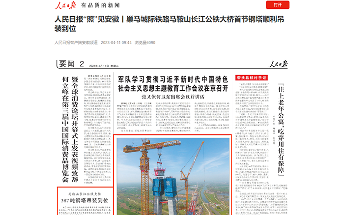 首节钢塔吊装过程获得《新闻联播》《东方时空》《人民日报》《央视新闻》、CCTV4、中国新闻网、新华报业网、《新民晚报》、安徽网、荆楚网、齐鲁网、高铁网、《马鞍山日报》等多家央省级主流媒体集中跟进报道,引起广泛关注。