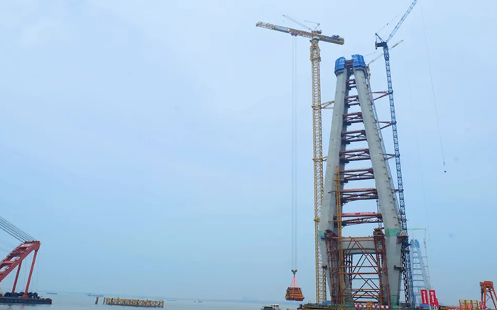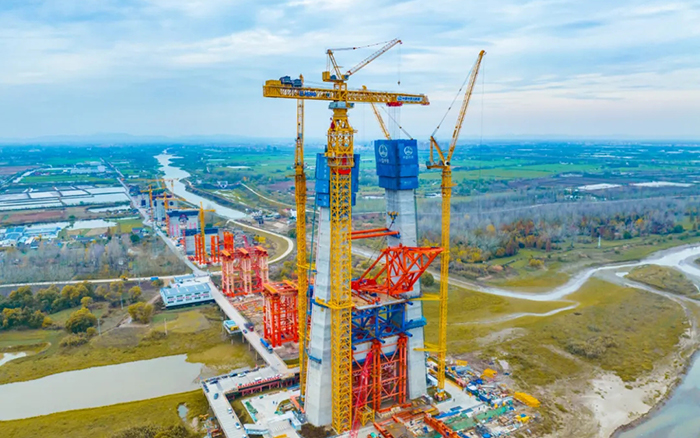 常泰长江大桥主航道桥主跨1176m,主塔总高352m。采用XGT15000-600S塔机进行上部钢塔柱施工吊装仅需将钢塔柱划分为30个吊装单元,最大单元重量超500t,较传统施工方式效率提升60%以上。
