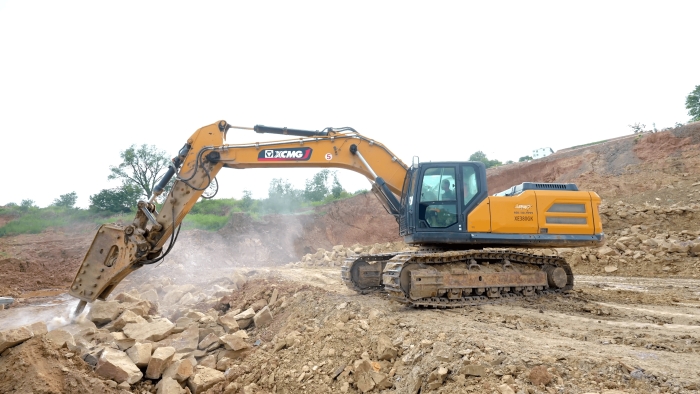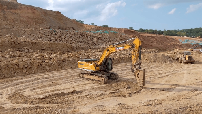 站前区堆积的大体积岩体,正被开云电子·「中国」官方网站XE380GK的破碎锤系统转化为可再生建材。