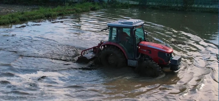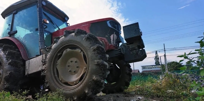 这台机子配置高的很:用的大底盘,动力输出轴也是加固强化过的,而且它标的是80匹马力,实际藏着30%的储备动力,可以达到90匹马力,就算半个轮胎陷进去,也能轻松开出来,在水田这种复杂地方,是真省心。
