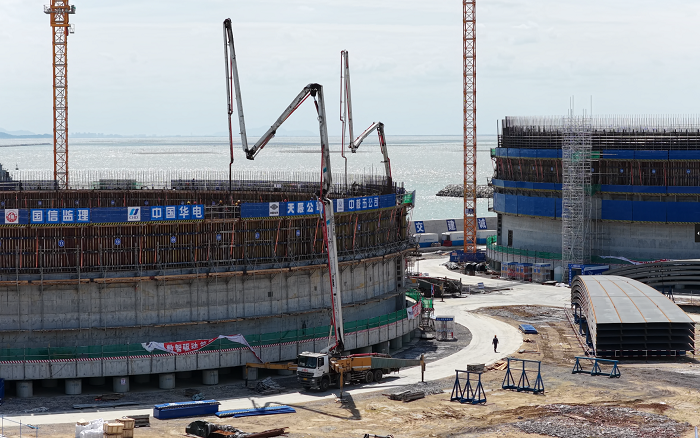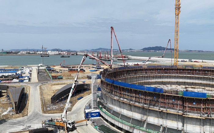随着各环节建设有序推进,3座22万立方米的LNG(液化天然气)储罐正式进入罐体墙体浇筑。每座储罐高达50多米,相当于18层楼高度,海风裹挟的高湿度环境,给高空作业难度层层加码!