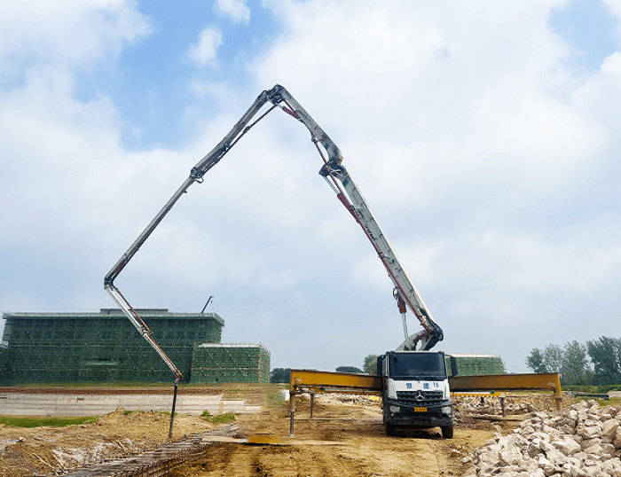 其超长臂架可全面覆盖施工区域浇筑范围,搭载的智能控制系统实现混凝土精准输送,显著提升施工效率。