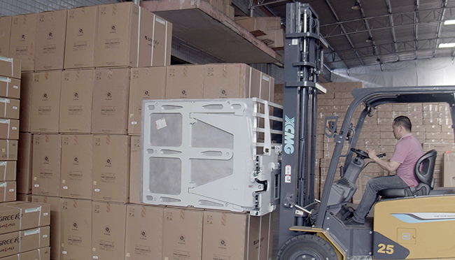 空调等家电单品价值高,鲲鹏电动叉车配备OPS安全防护系统、转弯降速等功能,属具方面专门为客户定制了纸箱夹,高支点转向桥,减小转弯时车身摆动幅度,进一步确保货物和人员安全。